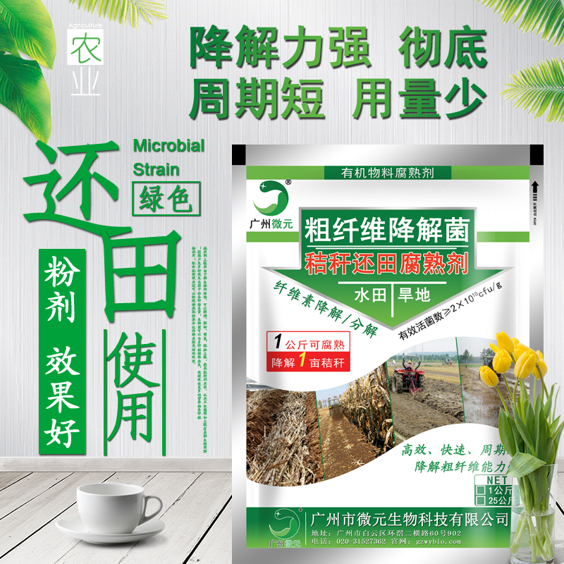 秸稈腐熟劑是根據玉米秸稈、小麥秸稈等農作物秸稈研發的秸稈腐熟粗纖維菌劑,秸稈中富含有機質、氮、磷、鉀和微量元素,是農業生產的有機肥源之一。秸稈腐熟劑能迅速將秸稈堆料中的碳、氮、磷、鉀等分解礦化,形成簡單有機物,從而進一步分解為作物可吸收的營養成分。同時,消除了秸稈堆料中的病蟲害、雜草種子等有害物質。秸稈或其它有機廢棄物(如禽畜糞便、廢煙末等等)的生物處理是將其無害化、資源化的有效處理技術,歐美及世界許多國家已進行多項產業化開發,其中重要的方法之一即是采用腐熟劑技術。