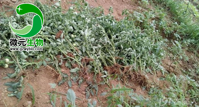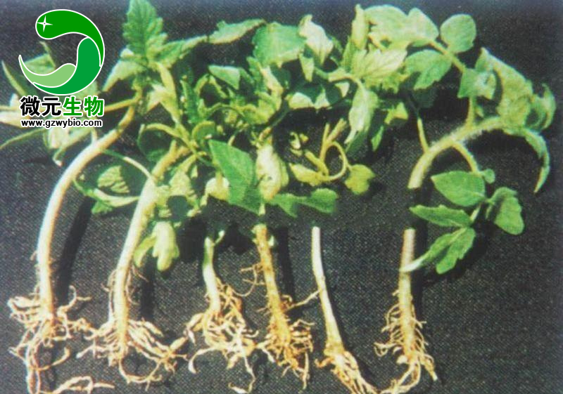 根結線蟲對番茄的危害一方面表現在由于根部根結線蟲的取食,氣食道腺分泌物刺激寄主細胞產生巨形細胞或合細胞,從而使植物體內礦物質代謝蛋白質和碳水化合物的合成、呼吸作用等正常生理化功能改變;另一方面根結線蟲與其它病原微生物聯合侵染,形成復合病害,而加重對寄生蟲的危害程度。根結線蟲侵入時留下的傷口,會導致土壤真菌病害如枯萎病、立枯病等真菌的侵入。對細菌性病害,曾報道南方根結線蟲和蘇假單孢菌,爪哇根結線蟲和根癌農桿菌聯合侵染的結果。