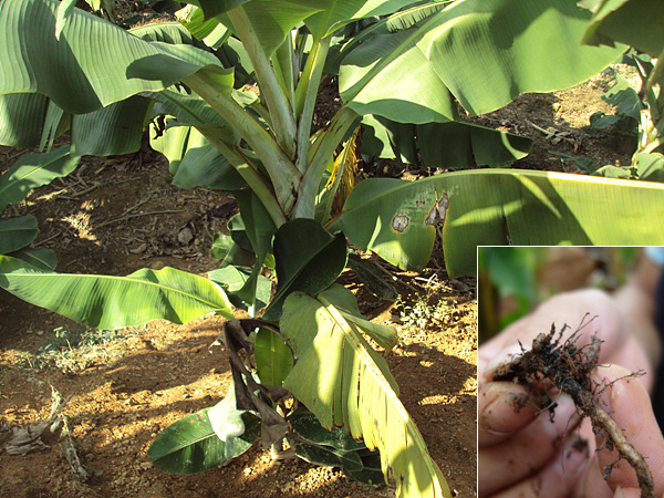 香蕉根結線蟲主要為害香蕉根部。在細根上形成大小不一的根瘤(根結),在粗根末端膨大呈鼓槌狀或長彎曲狀,須根少,黑褐色,嚴重時表皮腐爛。切開病根可鏡檢到白色、褐色的梨形雌蟲和充滿卵粒的膠質卵囊,受侵部位形成巨型細胞,韌皮部大量組織壞死,木質部特別膨大,導管阻塞。地上部初期癥狀不明顯,一般表現為葉黃,植株矮小,似缺水缺肥狀,后期嚴重者葉片黃化、枯萎,抽蕾困難,果實瘦小,植株早衰。