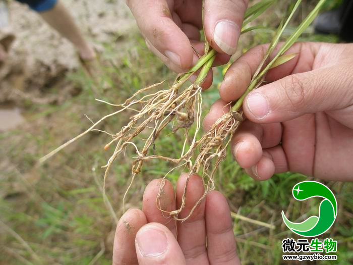 水稻根結線蟲屬專一性寄生線蟲,寄生于水稻和陸稻上。主要危害須根,尤以根尖為重,形成根結,嚴重時地上部分矮化發黃。隨著地下部根瘤數目的增加,地上部表現缺肥癥狀,病苗葉色變淡,纖弱,移植后返青慢,發根遲,長勢差,死苗多。至分蘗期,根瘤數量大增,癥狀更加明顯,表現為植株矮小,根短,葉片均勻黃化,莖稈纖細,分蘗力減弱。抽穗期病株矮小、葉黃、出穗難。呈包頸或不能出穗。結實期,病株穗短,結實少,秕谷多。
