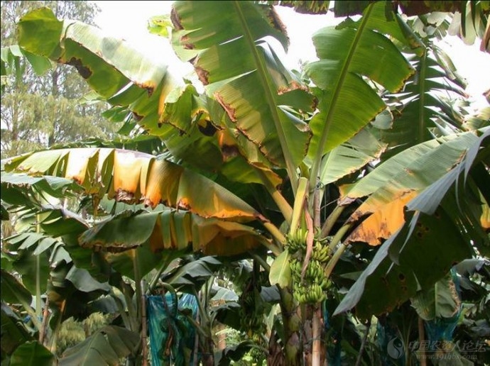 香蕉巴拿馬病也稱鐮刀菌枯萎病、黃葉病,在我國主要在粉蕉、龍芽蕉等蕉種上發(fā)生。病菌從根部入侵,受傷的根部受浸水易染病。病原體在香蕉木質(zhì)部發(fā)展,堵塞維管束,并產(chǎn)生毒素,使之壞死。一般在雨季(5-6月)感染,10-11月發(fā)病高峰期。 其傳染和危害特點像棉花枯黃萎病,可以采取類似措施,如檢疫、種植抗耐病蕉和土壤消毒等。發(fā)現(xiàn)病株可用草甘膦將病毒殺死,就地燒毀,病穴用生石灰等封閉。 發(fā)病季節(jié)使用銅高尚、冠菌清等銅制劑和碘制劑、中生菌素等定期灌根有一定的預防效果。