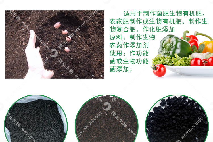 適用于制作菌肥生物有機(jī)肥、農(nóng)家肥制作成生物有機(jī)肥、制作生物復(fù)合肥、作化肥添加原料、制作生物農(nóng)藥作添加劑使用;作功能菌或生物功能菌添加。
