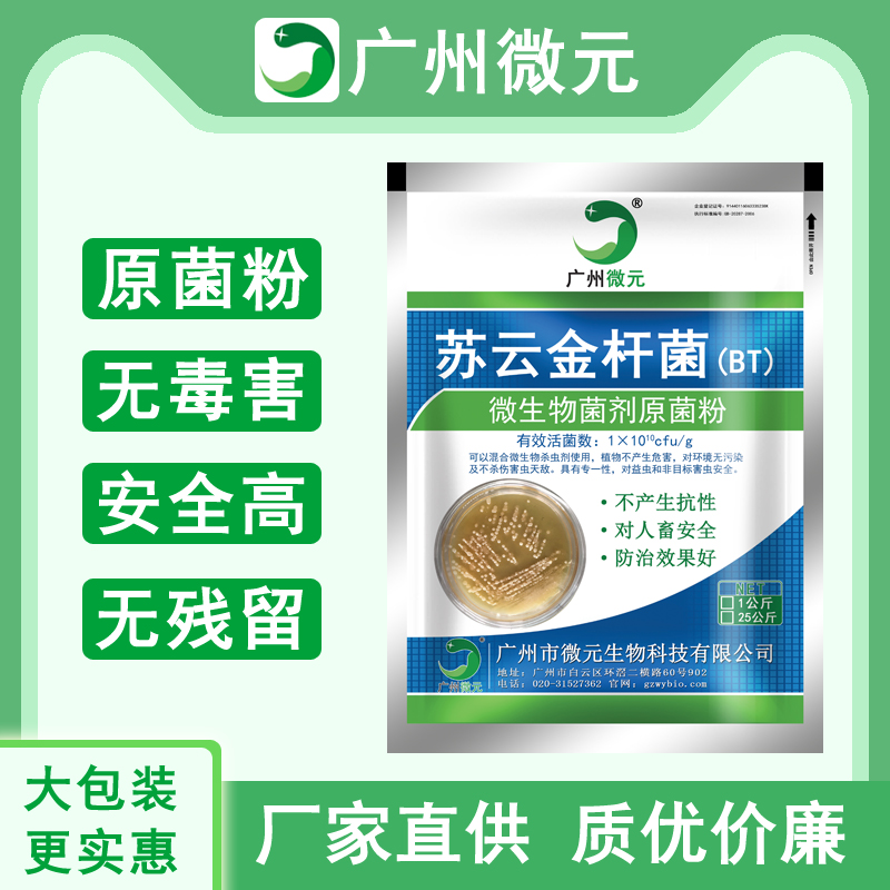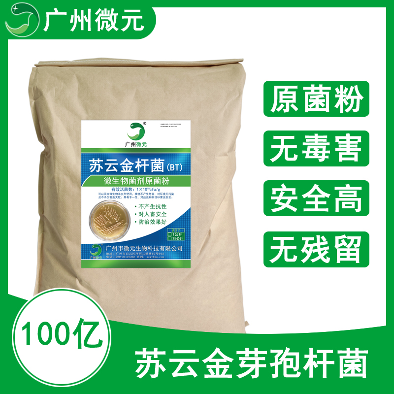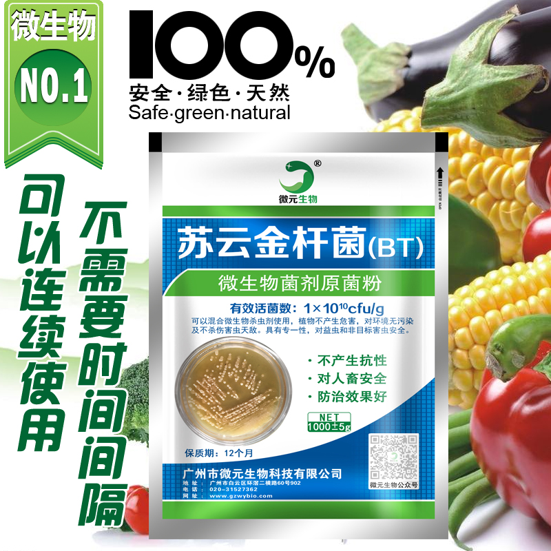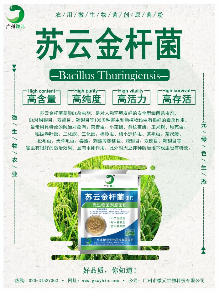 蘇云金桿菌簡稱Bt,是一類產晶體的芽孢桿菌。具有使昆蟲腸道麻痹,停止取食,破壞腸道內膜,造成細菌營養細胞易于侵襲和穿腸道底膜進入血淋巴,最后因饑餓和敗血癥而死。能有效防治茶樹茶毛蟲、棉花二代棉鈴蟲、森林松毛蟲、十字花科蔬菜菜青蟲、小菜蛾、水稻道縱卷葉螟、煙草煙青蟲、玉米玉米螟、棗樹棗尺蠖。