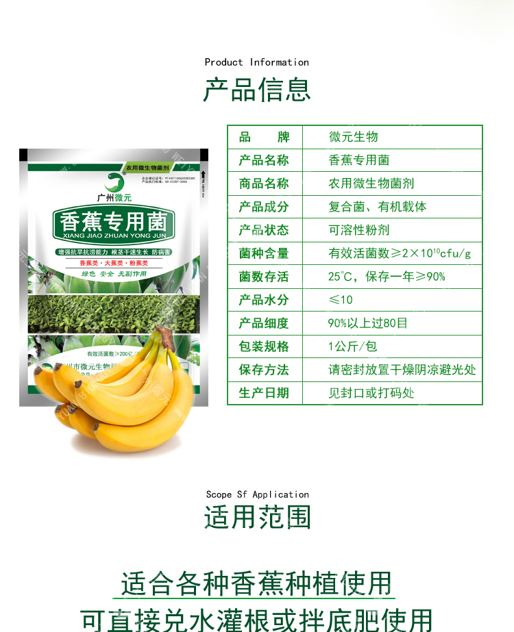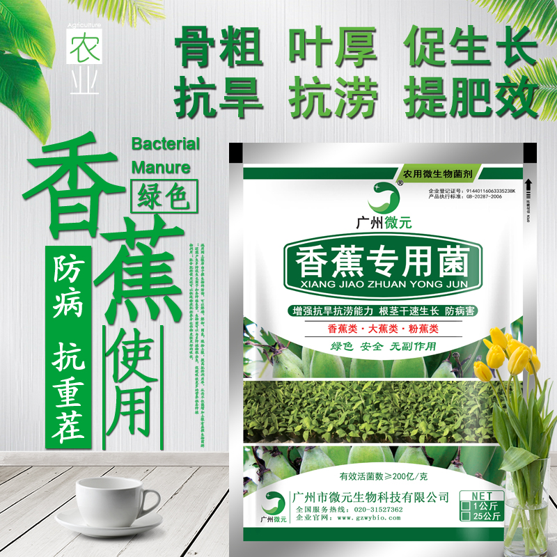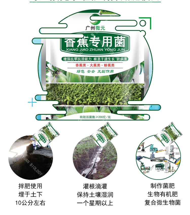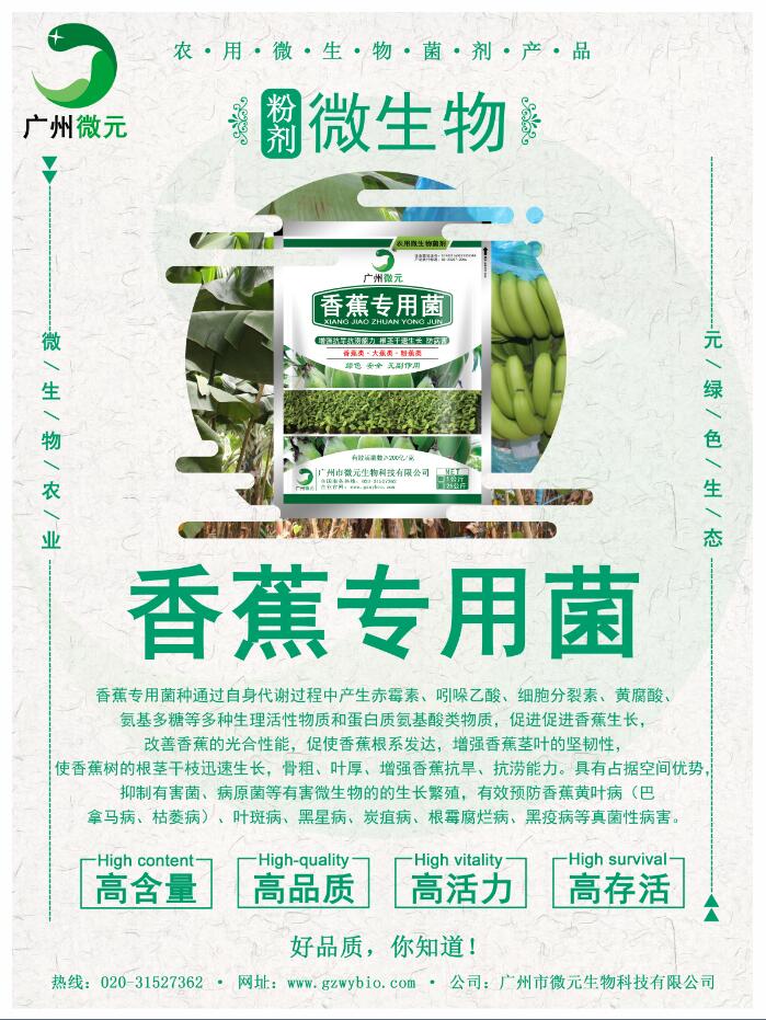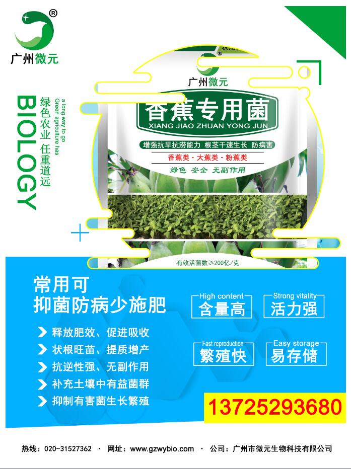 本產品系通過高科技生物技術研制開發的復合農用微生物菌劑產品,具有綠色、環保、安全、無毒無副作用等特點;能分泌合成多種有機酸、酶、生理活性等物質促進作物生長,提高免疫力。施用到土壤后由于微生物的活動,可以解磷、解鉀、固氮,疏松土壤,提高肥料利用率,從而不僅能增加土壤有益微生物菌群;還能產生多種促生長因子和各種維生素,生物菌可以與多種植物根共生,促進吸收更多的營養供各種植物利用;配合肥料使用還可以快速釋放肥料養分讓作物更快更好的吸收。使香蕉樹的根莖干枝迅速生長,骨粗、葉厚、增強香蕉抗旱、抗澇能力。