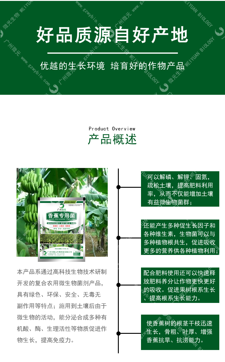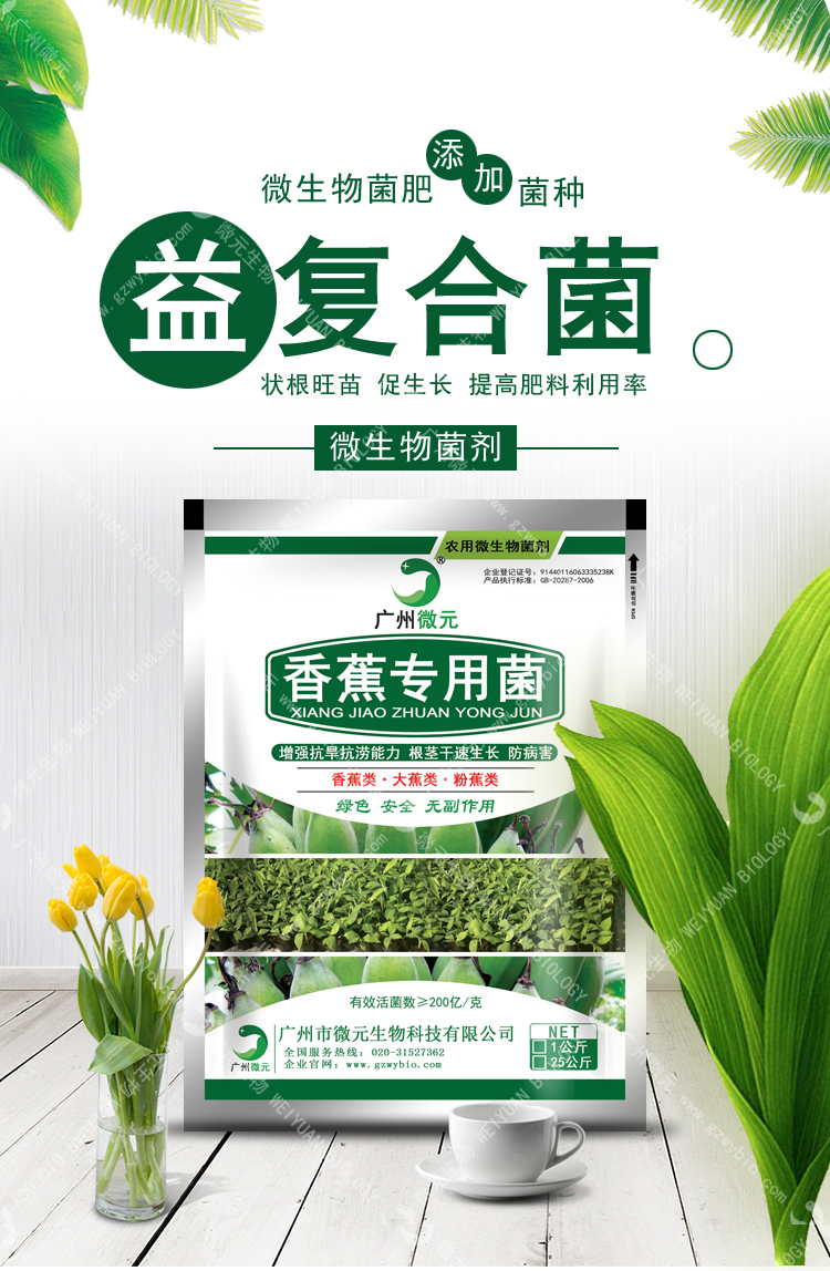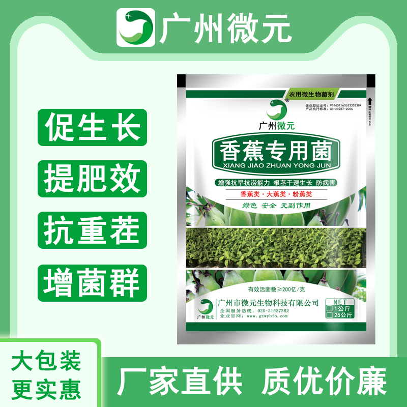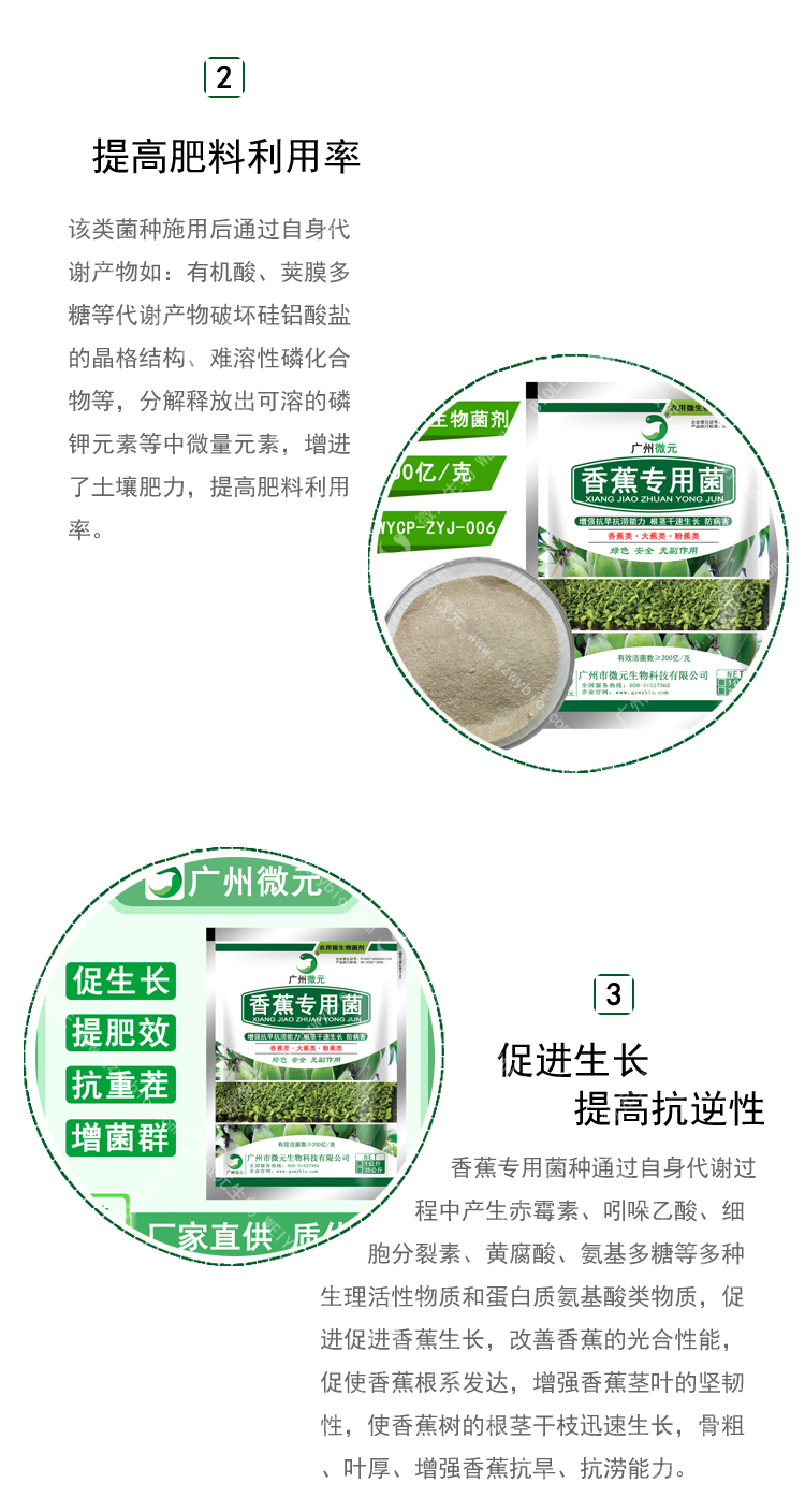 本產品系通過高科技生物技術研制開發的復合農用微生物菌劑產品,具有綠色、環保、安全、無毒無副作用等特點;能分泌合成多種有機酸、酶、生理活性等物質促進作物生長,提高免疫力。施用到土壤后由于微生物的活動,可以解磷、解鉀、固氮,疏松土壤,提高肥料利用率,從而不僅能增加土壤有益微生物菌群;還能產生多種促生長因子和各種維生素,生物菌可以與多種植物根共生,促進吸收更多的營養供各種植物利用;配合肥料使用還可以快速釋放肥料養分讓作物更快更好的吸收。使香蕉樹的根莖干枝迅速生長,骨粗、葉厚、增強香蕉抗旱、抗澇能力。