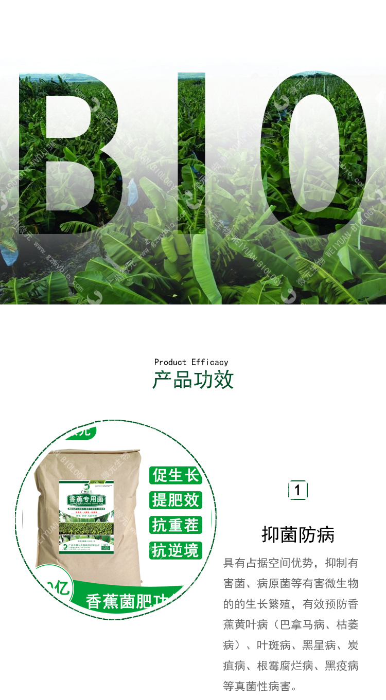 1、抑菌防病:具有占據空間優勢,抑制有害菌、病原菌等有害微生物的的生長繁殖,有效預防香蕉黃葉病(巴拿馬病、枯萎病)、葉斑病、黑星病、炭疽病、根霉腐爛病、黑疫病等真菌性病害。