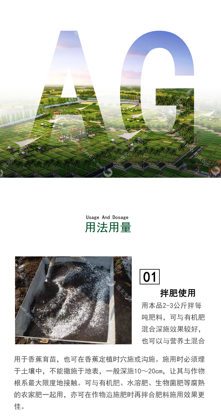 1、拌肥使用:用本品2-3公斤拌每噸肥料,可與有機肥混合深施效果較好,也可以與營養土混合用于香蕉育苗,也可在香蕉定植時穴施或溝施。施用時必須埋于土壤中,不能撒施于地表,一般深施10~20cm,讓其與作物根系最大限度地接觸。可與有機肥、水溶肥、生物菌肥等腐熟的農家肥一起用,亦可在作物追施肥時再拌合肥料施用效果更佳。