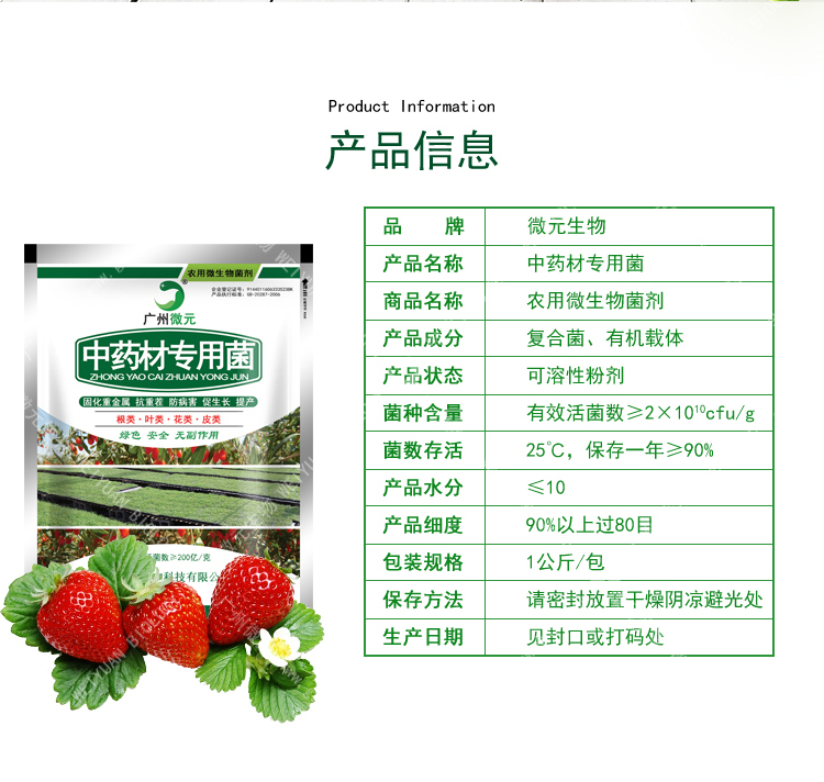本產(chǎn)品系通過高科技生物技術(shù)研制開發(fā)的復(fù)合農(nóng)用微生物菌劑產(chǎn)品,具有綠色、環(huán)保、安全、無毒無副作用等特點(diǎn);能分泌合成多種有機(jī)酸、酶、生理活性等物質(zhì)促進(jìn)作物生長(zhǎng),提高免疫力。施用到土壤后由于微生物的活動(dòng),可以解磷、解鉀、固氮,疏松土壤,提高肥料利用率,從而不僅能增加土壤有益微生物菌群;還能產(chǎn)生多種促生長(zhǎng)因子和各種維生素,生物菌可以與多種植物根共生,促進(jìn)吸收更多的營(yíng)養(yǎng)供各種植物利用;配合肥料使用還可以快速釋放肥料養(yǎng)分讓作物更快更好的吸收。提高藥材有效成分含量,提高中藥材的營(yíng)養(yǎng)品質(zhì),降低藥材重金屬含量。