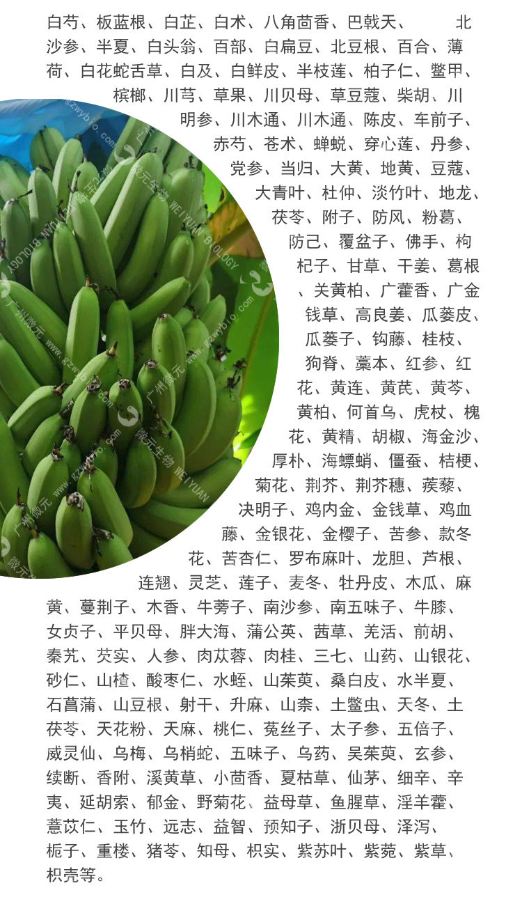 白芍、板藍(lán)根、白芷、白術(shù)、八角茴香、巴戟天、北沙參、半夏、白頭翁、百部、白扁豆、北豆根、百合、薄荷、白花蛇舌草、白及、白鮮皮、半枝蓮、柏子仁、鱉甲、檳榔、川芎、草果、川貝母、草豆蔻、柴胡、川明參、川木通、川木通、陳皮、車前子、赤芍、蒼術(shù)、蟬蛻、穿心蓮、丹參、黨參、當(dāng)歸、大黃、地黃、豆蔻、大青葉、杜仲、淡竹葉、地龍、茯苓、附子、防風(fēng)、粉葛、防己、覆盆子、佛手、枸杞子、甘草、干姜、葛根、關(guān)黃柏、廣藿香、廣金錢草、高良姜、瓜蔞皮、瓜蔞子、鉤藤、桂枝、狗脊、藁本、紅參、紅花、黃連、黃芪、黃芩、黃柏、何首烏、虎杖、槐花、黃精、胡椒、海金沙、厚樸、海螵蛸、僵蠶、桔梗、菊花、荊芥、荊芥穗、蒺藜、決明子、雞內(nèi)金、金錢草、雞血藤、金銀花、金櫻子、苦參、款冬花、苦杏仁、羅布麻葉、龍膽、蘆根、連翹、靈芝、蓮子、麥冬、牡丹皮、木瓜、麻黃、蔓荊子、木香、牛蒡子、南沙參、南五味子、牛膝、女貞子、平貝母、胖大海、蒲公英、茜草、羌活、前胡、秦艽、芡實(shí)、人參、肉蓯蓉、肉桂、三七、山藥、山銀花、砂仁、山楂、酸棗仁、水蛭、山茱萸、桑白皮、水半夏、石菖蒲、山豆根、射干、升麻、山柰、土鱉蟲、天冬、土茯苓、天花粉、天麻、桃仁、菟絲子、太子參、五