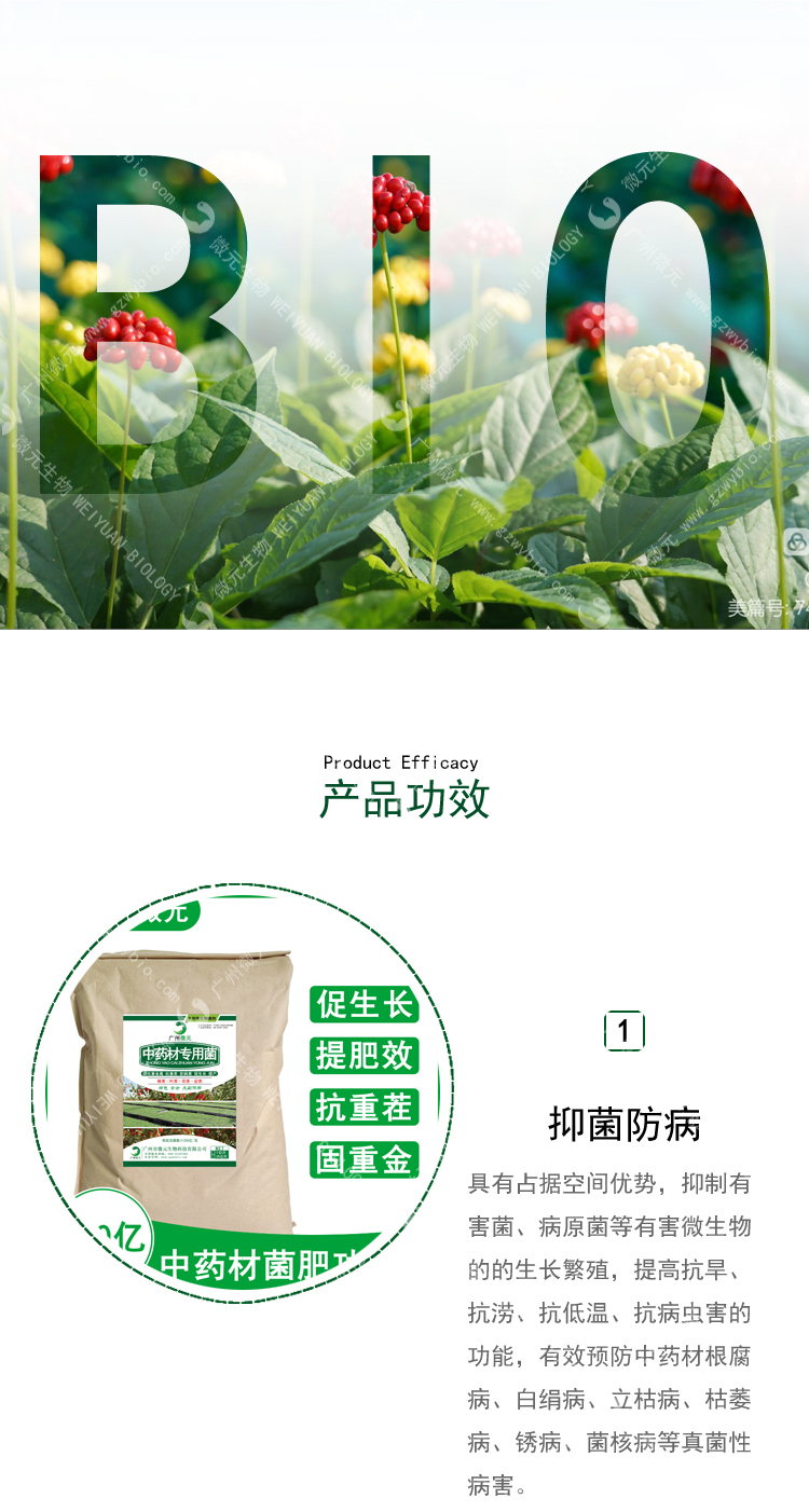 1、抑菌、滅害力強(qiáng):具有占據(jù)空間優(yōu)勢(shì),抑制有害菌、病原菌等有害微生物的的生長(zhǎng)繁殖,提高抗旱、抗?jié)场⒖沟蜏亍⒖共∠x害的功能,有效預(yù)防中藥材根腐病、白絹病、立枯病、枯萎病、銹病、菌核病等真菌性病害。