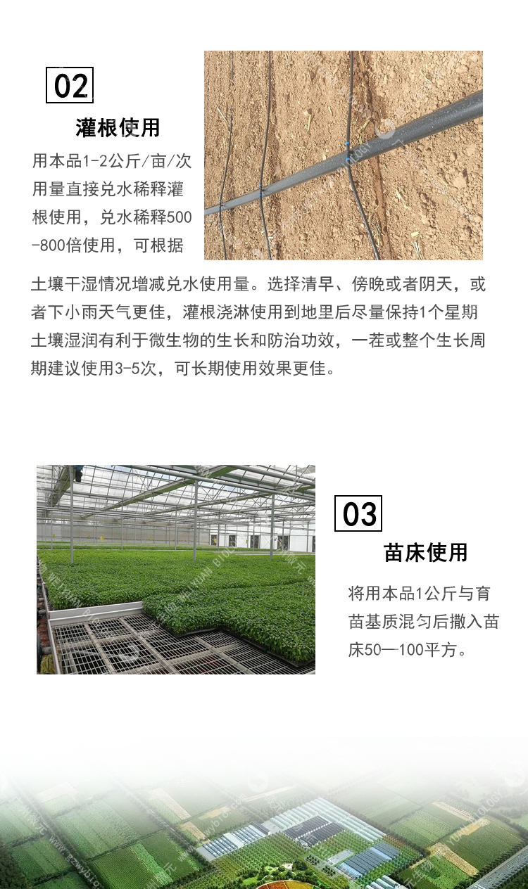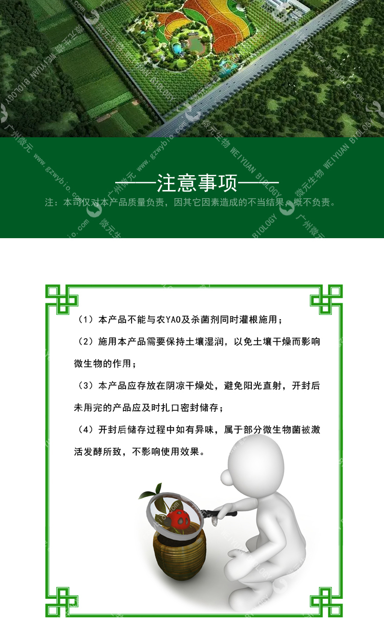 (2)施用本產(chǎn)品需要保持土壤濕潤(rùn),以免土壤干燥而影響微生物的作用;