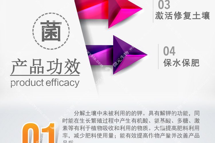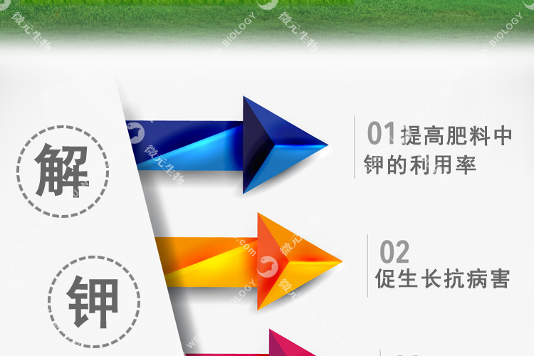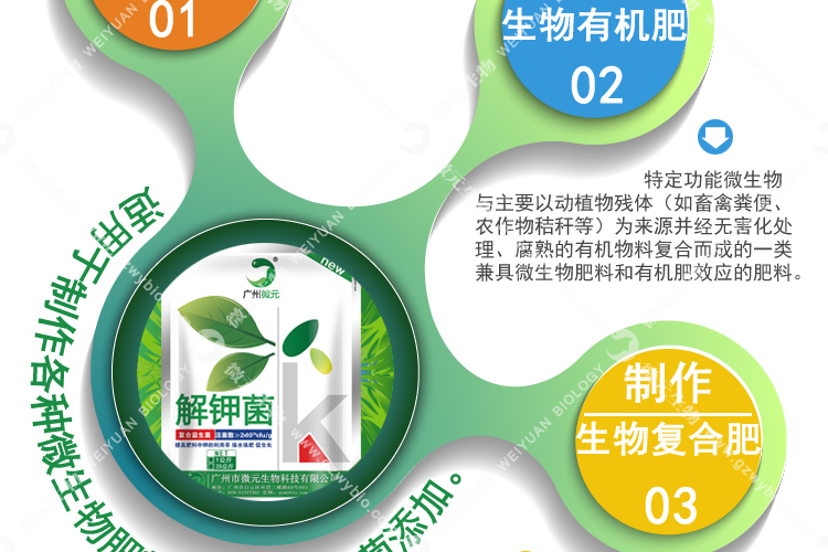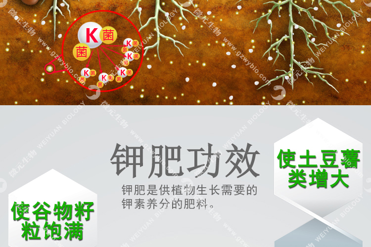 1.提高肥料中鉀的利用率:分解土壤中未被利用的的鉀。具有解鉀的功能,同時(shí)能在生長(zhǎng)繁殖過(guò)程中產(chǎn)生有機(jī)酸、氨基酸、多糖、激素等有利于植物吸收和利用的物質(zhì)。大幅提高肥料利用率,減少肥料使用量;能有效提高作物產(chǎn)量并改善產(chǎn)品品質(zhì)。