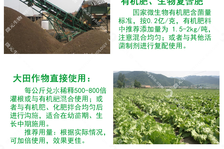 添加比例:按國(guó)家微生物有機(jī)肥含菌量0.2億/克標(biāo)準(zhǔn),肥料中推薦添加量為1.5-2kg/噸,注意混合均勻;或者與其他活菌制劑進(jìn)行復(fù)配使用。