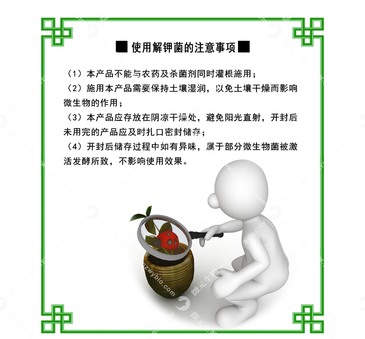 (2)施用本產(chǎn)品需要保持土壤濕潤(rùn),以免土壤干燥而影響微生物的作用;