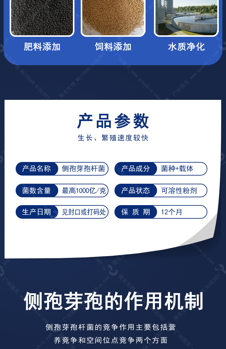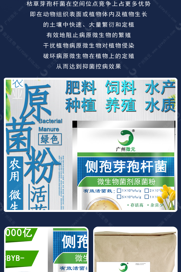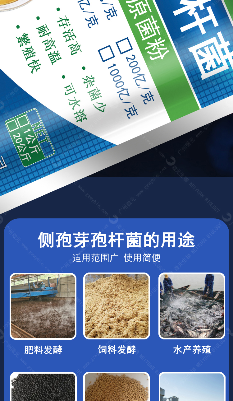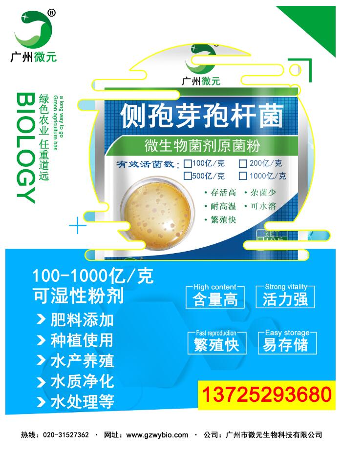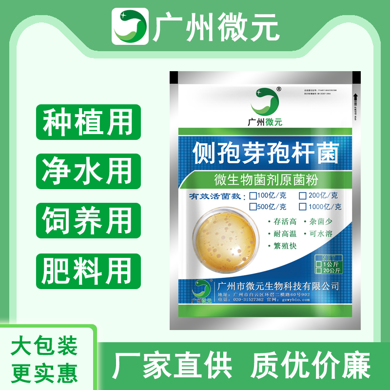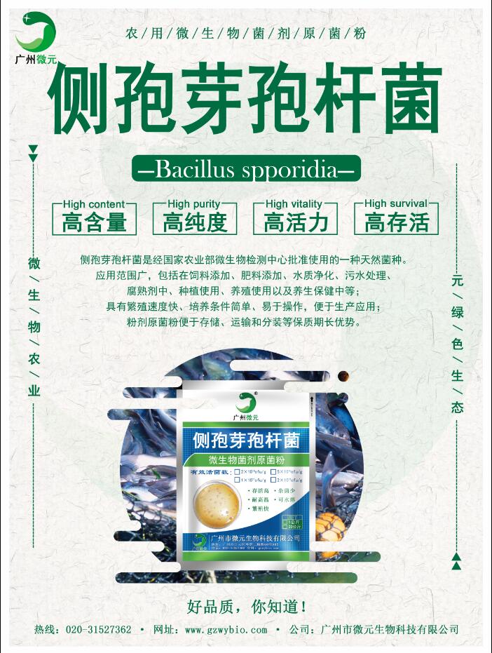 微元-側孢芽孢桿菌是經國家農業部微生物檢測中心批準使用的一種天然菌種。具有繁殖快速、生命力強、安全無毒等特點。側孢芽孢桿菌屬于芽孢桿菌屬,革蘭氏染色陽性,可變為陰性,芽孢為橢圓形,側生、中生或近中生,孢囊膨大,游離芽孢一邊比另一邊厚(獨木舟形)。好氧菌、可利用蛋白質、多種糖及淀粉,分解色氨酸形成吲哚。