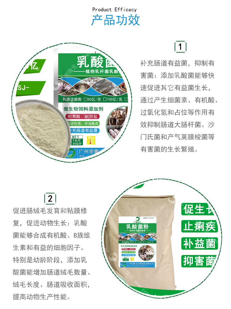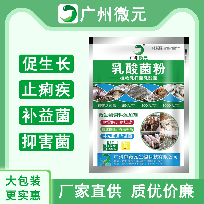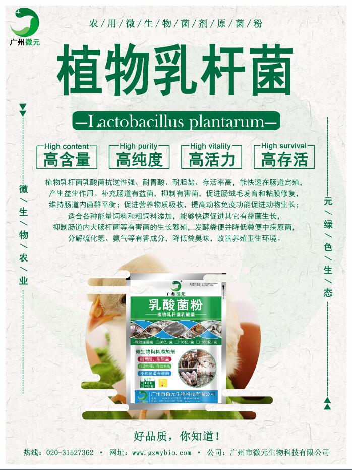微元-乳酸菌菌種微生物養殖飼料發酵菌含量高,菌體表面形成菌毛,腸道附著能力強,是通過液體微生物發酵直接制備而成的純菌粉制劑。適合各種能量飼料和粗飼料,如稻谷粉、玉米粉、麥麩、米糠及農作物秸桿、棉籽殼和牧草等,經發酵后的能量飼料轉化成了菌體蛋白飼料,而粗飼料轉化成了精飼料。本品抗逆性強、耐胃酸、耐膽鹽、存活率高,能快速在腸道定殖,產生益生作用。添加乳酸菌能夠快速促進其它有益菌生長,通過產生細菌素、有機酸、過氧化氫和占位等作用有效抑制大腸桿菌、沙門氏菌和產氣莢膜梭菌的生長繁殖。