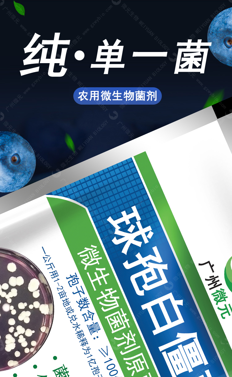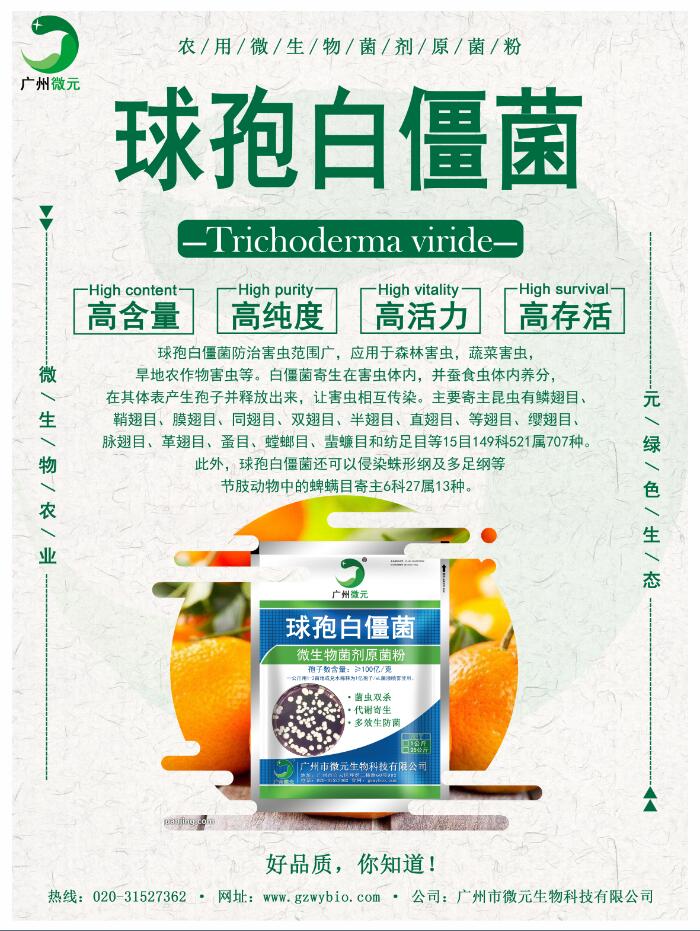 微元球孢白僵菌(Beauveria bassiana)是世界上研究和應用較多的昆蟲病原真菌之一,其分生孢子的表面具有粗糙的皺折,它是一種β-胡蘿卜醇的聚合物,能增強分生孢子對不良環境的抵抗力,對許多農林害蟲是有效的侵染體,可侵染包括 15 個 目、149 個科的 700 多種昆蟲及蜱螨目的 6 科 10 余種螨和蜱。自 20 世紀 70 年代以來我國應用此菌防治農林害蟲的規模一直居世界前列,尤其是在利用球孢白僵菌防治亞洲玉米螟和馬尾松毛蟲的應用上。1991年Bing和Lewis首次發現了球孢白僵菌的植物內生性,為對利用白僵菌植物內生性提高作 物抗蟲能力提供了新思路。