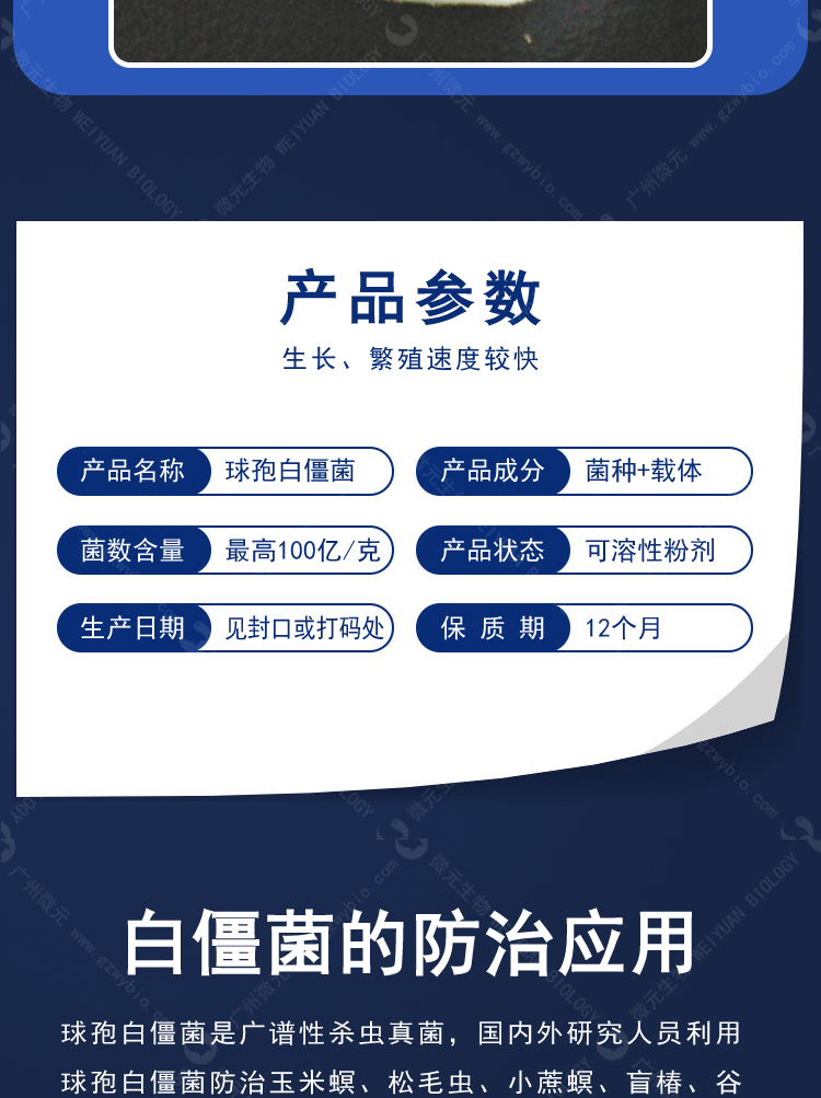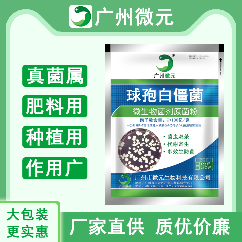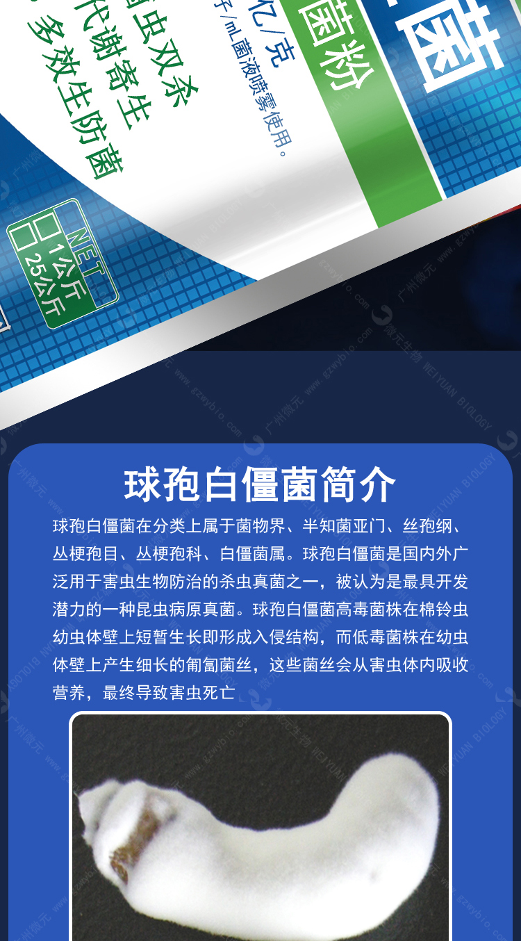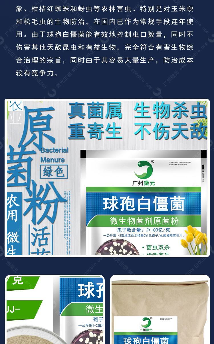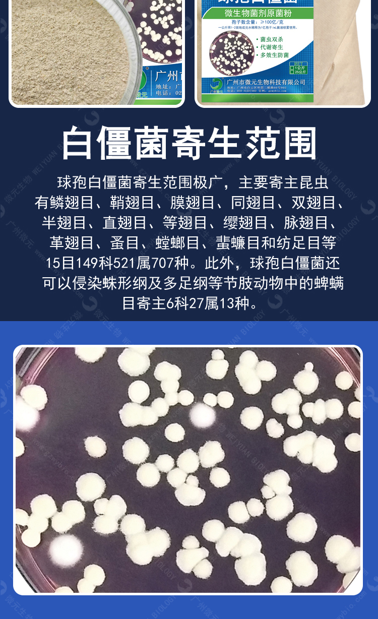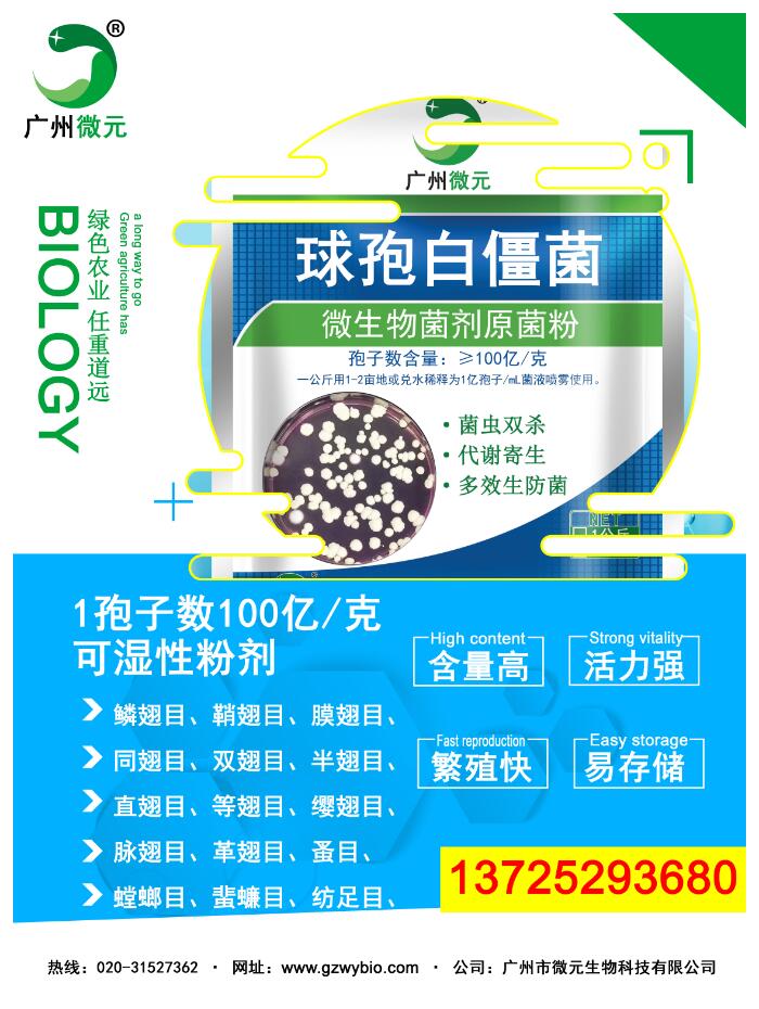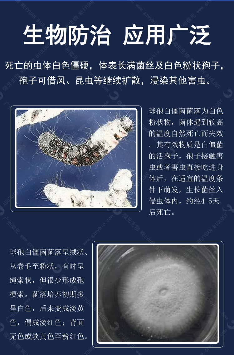 球孢白僵菌防治害蟲范圍廣,應用于森林害蟲,蔬菜害蟲,旱地農作物害蟲等。白僵菌寄生在害蟲體內,并蠶食蟲體內養分,在其體表產生孢子并釋放出來,讓害蟲相互傳染。主要寄主昆蟲有鱗翅目、鞘翅目、膜翅目、同翅目、雙翅目、半翅目、直翅目、等翅目、纓翅目、脈翅目、革翅目、蚤目、螳螂目、蜚蠊目和紡足目等15目149科521屬707種。此外,球孢白僵菌還可以侵染蛛形綱及多足綱等節肢動物中的蜱螨目寄主6科27屬13種。生產上多用于防治松毛蟲、松葉蜂、松尺蠖、松梢螟、松小蠹、天牛、女貞尺蛾、玉米螟、甘薯象甲、麥蝽象、棉紅蜘蛛、大豆食心蟲、菜青蟲、馬鈴薯象甲、桃小食心蟲、板栗象甲、地老虎、金龜甲、螻蛄、叩頭蟲、葉甲、蝽、蝗、葉蜂、葉蟬、蚊、蟻等害蟲。在我國主要用來防治甘薯象甲、大豆食心蟲、地老虎、玉米螟、棉鈴蟲、黏蟲、稻黑尾葉蟬、稻飛虱、三化螟、稻苞蟲類、茶樹小黃卷葉蛾、茶毛蟲、三葉草夜蛾、甜菜象甲、油菜象甲、金龜甲、葉甲、油菜尺蠖、馬鈴薯二十八星瓢蟲、菜青蟲、甘藍夜蛾、蘋果蠹蛾、桃小、天牛、松毛蟲等害蟲。