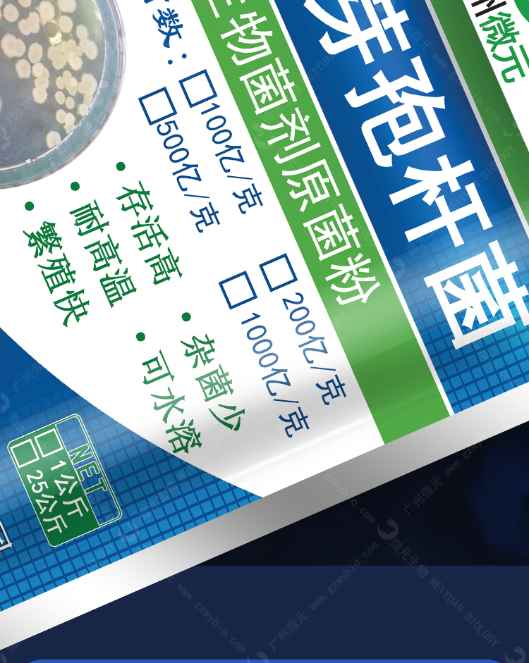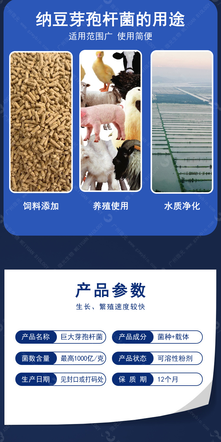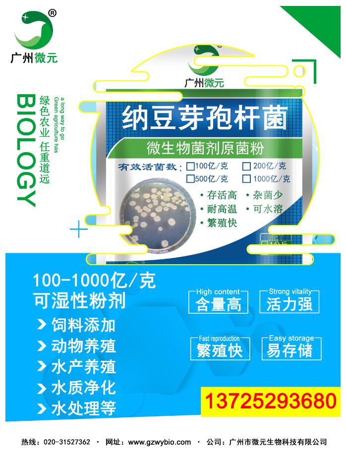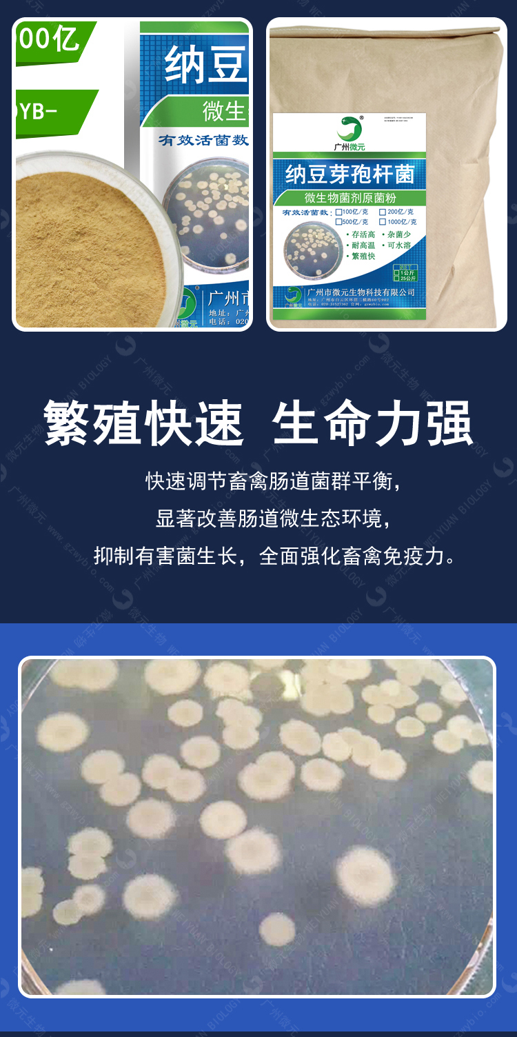 納豆芽孢桿菌是經國家農業部微生物檢測中心批準使用的一種天然菌種;具有繁殖快速、生命力強、安全無毒等特點;芽孢橢圓形或柱狀,中生或偏中生,即使孢囊膨大,也不顯著,有鞭毛,能運動;生長溫度最高為45-55℃,最低為5-20℃;孢子耐熱性強。納豆芽孢桿菌能分泌合成多種有機酸、酶、生理活性物質等。