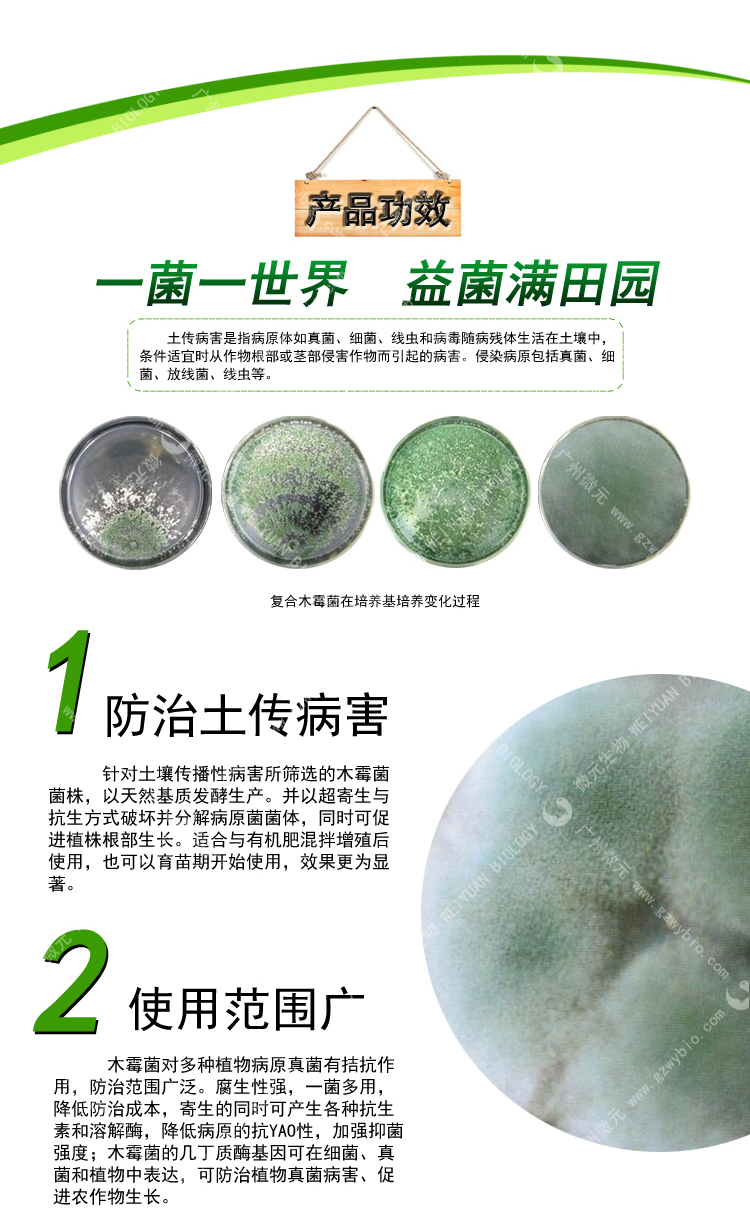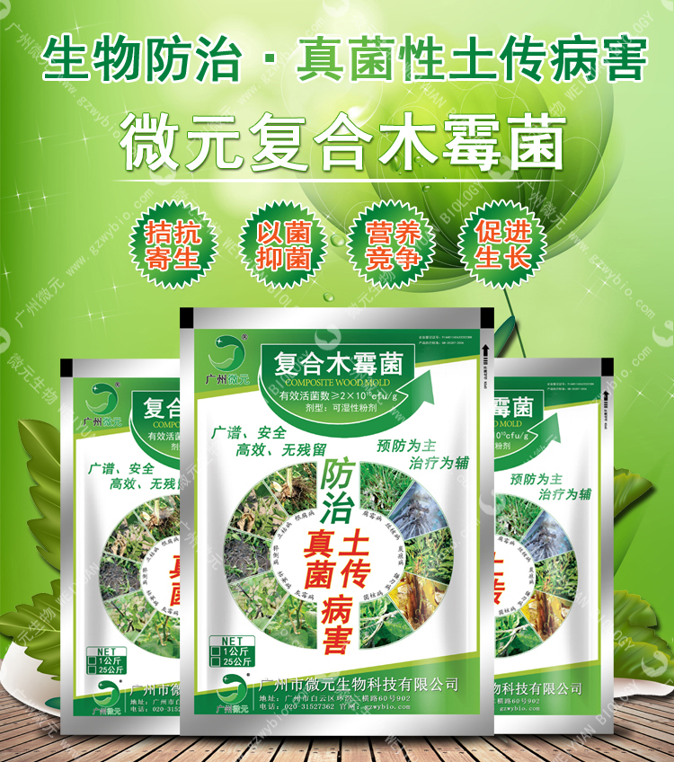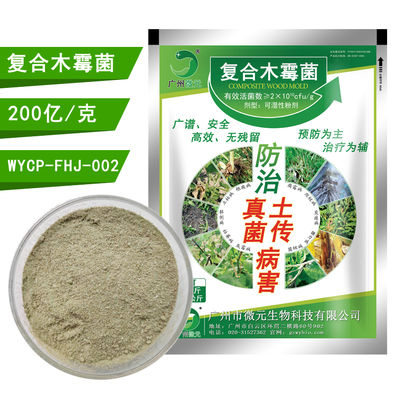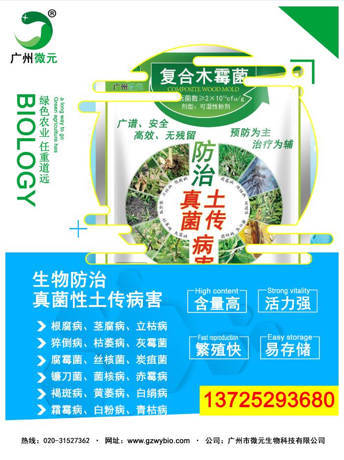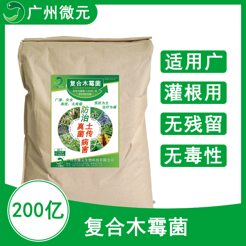 微元-復(fù)合木霉菌是新型生物農(nóng)藥菌劑。通過產(chǎn)生抗生素、營養(yǎng)競爭、微寄生、細(xì)胞壁分解酵素、以及誘導(dǎo)植物產(chǎn)生抗性等機(jī)制,對于多種植物病原菌具有拮抗作用,復(fù)合木霉菌具有保護(hù)和治療雙重功效,可有效防治土傳性真菌病害,在苗床使用木霉菌劑,可提高育苗與移植的成活率,保持秧苗健壯生長。也可用于防治灰霉??;特效期長,作用位點(diǎn)多,不產(chǎn)生抗藥性,突破常規(guī)殺菌劑受限條件,不怕高濕,而且濕度越大防治效果越好。殺菌譜廣,無殘留毒性,對作物沒有任何不良影響。