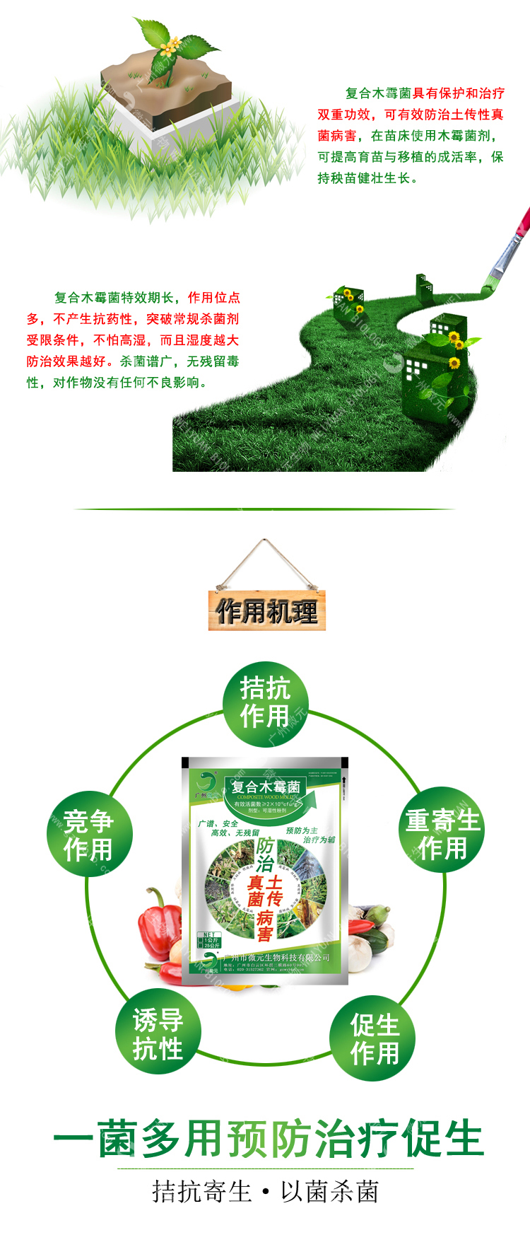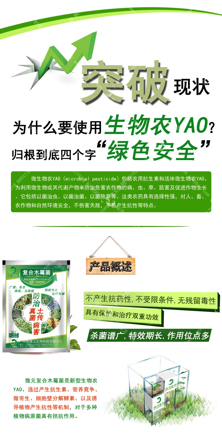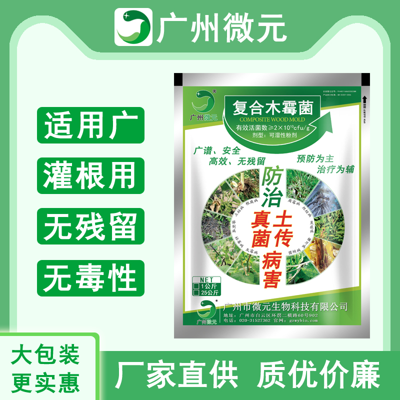微元-復(fù)合木霉菌是新型生物農(nóng)藥菌劑。通過產(chǎn)生抗生素、營養(yǎng)競爭、微寄生、細(xì)胞壁分解酵素、以及誘導(dǎo)植物產(chǎn)生抗性等機(jī)制,對于多種植物病原菌具有拮抗作用,復(fù)合木霉菌具有保護(hù)和治療雙重功效,可有效防治土傳性真菌病害,在苗床使用木霉菌劑,可提高育苗與移植的成活率,保持秧苗健壯生長。也可用于防治灰霉??;特效期長,作用位點(diǎn)多,不產(chǎn)生抗藥性,突破常規(guī)殺菌劑受限條件,不怕高濕,而且濕度越大防治效果越好。殺菌譜廣,無殘留毒性,對作物沒有任何不良影響。