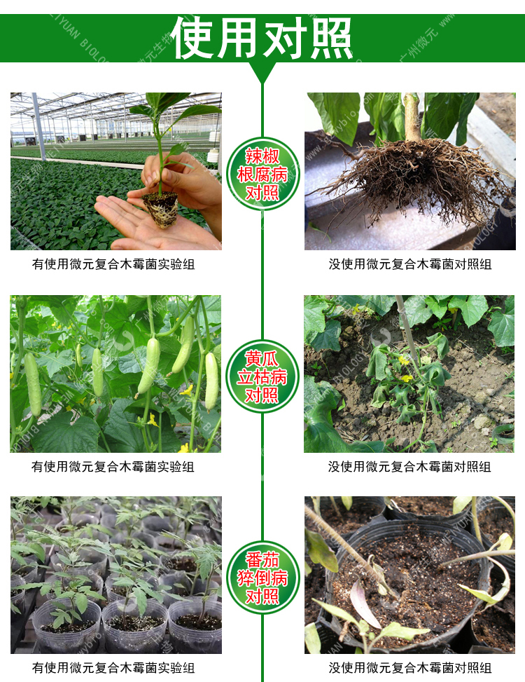 4、根部處理:移栽前,復(fù)合木霉菌劑1公斤稀釋100倍液浸根30分鐘,然后定值;移栽后,可用300-500倍液灌根。