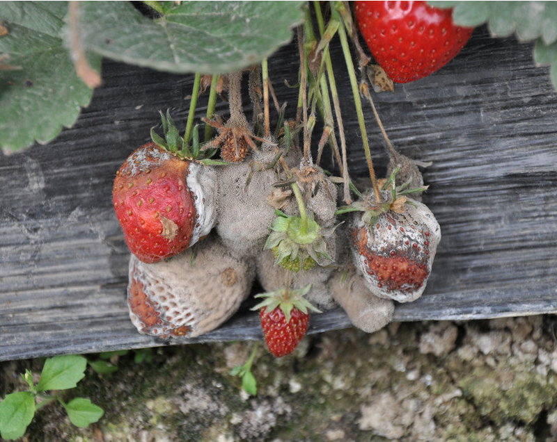 草莓灰霉病是大棚栽培草莓的重要病害。開花后在葉柄、葉片、花蕾、花、果柄、果實上均可發生,最嚴重的是果實發病。葉上發病時,產生褐色水漬狀病斑,濕度較高時,葉背出現白色絨毛狀菌絲。葉柄、果柄受侵染后變褐,病斑常環繞葉柄、果柄,最后萎蔫干枯。果實發病出現油漬狀淡褐色小斑點,隨之斑點擴大,全果變軟,上生灰色霉狀物。