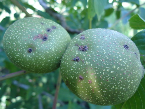 核桃炭疽病癥狀,果實受害后,果皮上出現褐色病斑,圓形或近圓形,中央下陷,病部有黑色小點產生,有時略呈紋狀排列。溫濕度適宜時,在黑點處涌出黏性粉紅色孢子團,即分生孢子盤和分生孢子。病果上的病斑一至數是個,可連接成片,是果實變仁的外皮部分變黑,降低出油率和核仁產量。果實成熟前病斑局限在外果皮,對核桃影響不達。