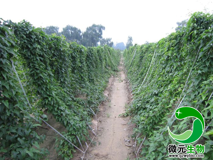 山藥根結線蟲病主要發生在地下塊莖部位,地上部一般沒有明顯的癥狀;淡紫擬青霉菌是一種純微生物活孢子制劑類新型生物農藥。其作用機理:淡紫擬青霉孢子萌發后,所產生的菌絲可穿透線蟲的卵殼、幼蟲及雌性成蟲體壁,菌絲在其體內吸取營養,進行繁殖,破壞卵、幼蟲及雌性成蟲的正常生理代謝,從而導致植物寄生線蟲死亡。